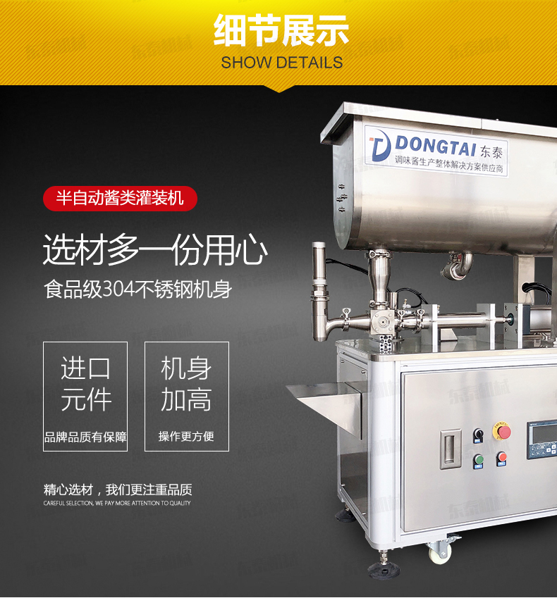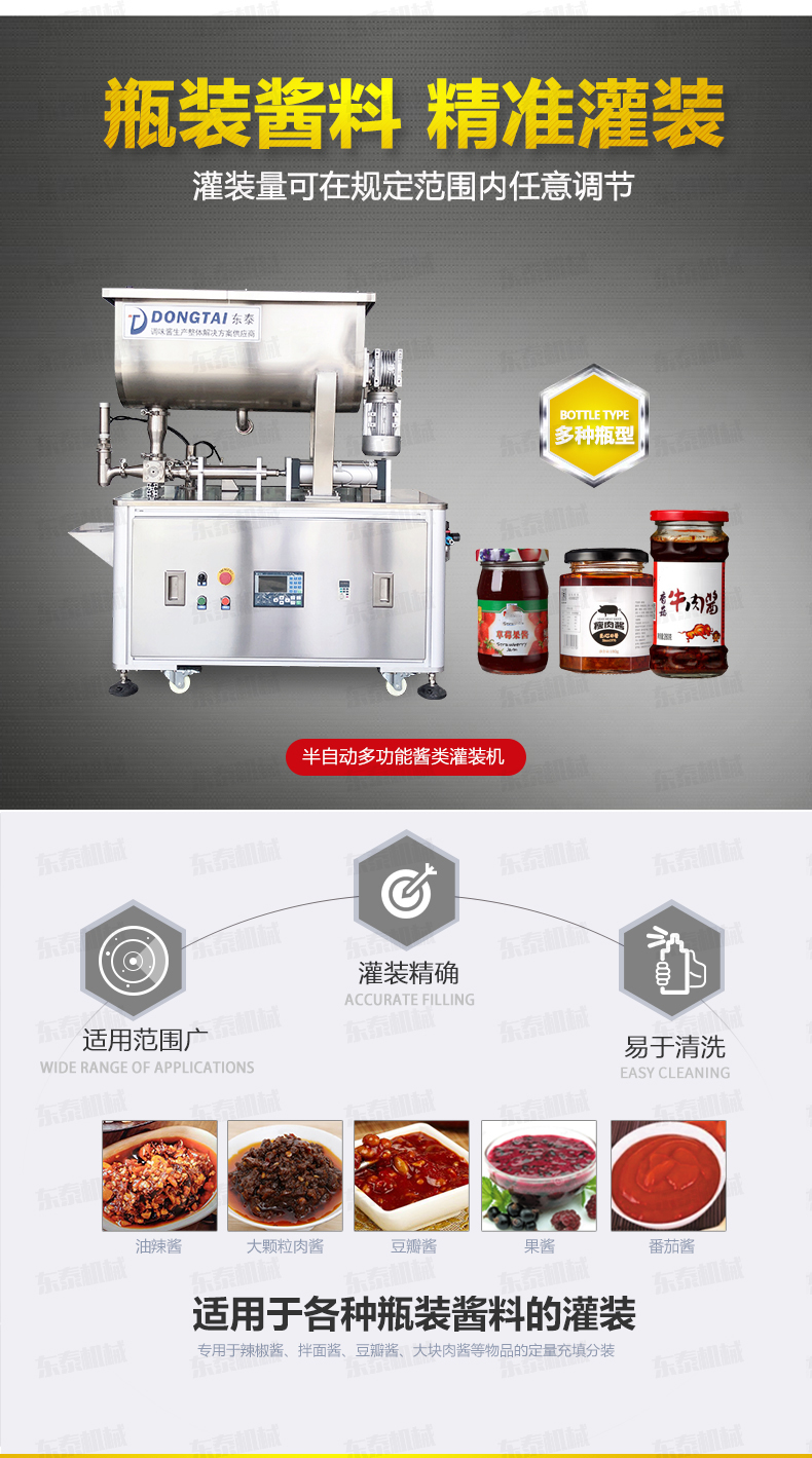 半自動(dòng)灌裝機(jī)械,配置的自動(dòng)攪拌器,保證了醬和油的充分混合,可灌裝顆粒漿狀流體物料在對(duì)辣椒醬、拌面醬、豆鼓等醬類(lèi)進(jìn)行灌裝時(shí),灌裝量可在規(guī)定范圍內(nèi)任意調(diào)節(jié),計(jì)量誤差小,該半自動(dòng)醬類(lèi)灌裝機(jī)采用壓縮空氣為動(dòng)力可在各種環(huán)境中使用。