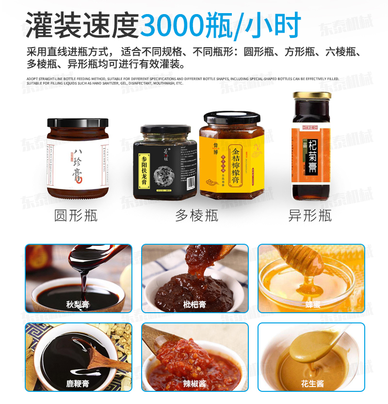 秋梨膏灌裝機(jī)生產(chǎn)線設(shè)備適用于各種1、各種膏滋如:秋梨膏、枇杷膏、鹿鞭膏、蜂蜜等的灌裝。2、調(diào)味醬如:香菇醬、辣椒醬、豆瓣醬、花生醬、芝麻醬、牛油火鍋底料、紅油火鍋底料。3、采用多規(guī)格的灌裝轉(zhuǎn)閥、灌裝頭,可適應(yīng)不同客戶物料的灌裝需求。
