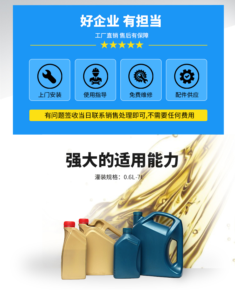 機(jī)器應(yīng)用范圍:1-10升通用型號(hào),機(jī)器采用流量計(jì)計(jì)量,觸摸屏控制,參數(shù)一鍵調(diào)整,方便快捷。可以灌裝各種油脂,油料。灌裝頭采用專用的油脂防滴漏灌裝頭,不滴漏。機(jī)器設(shè)定有快慢速技術(shù),可以先快后慢,防止物料噴濺。保持生產(chǎn)車間干凈潔凈。