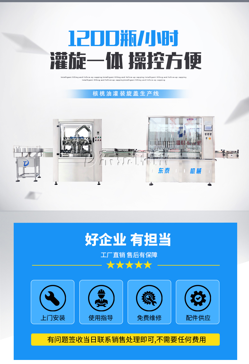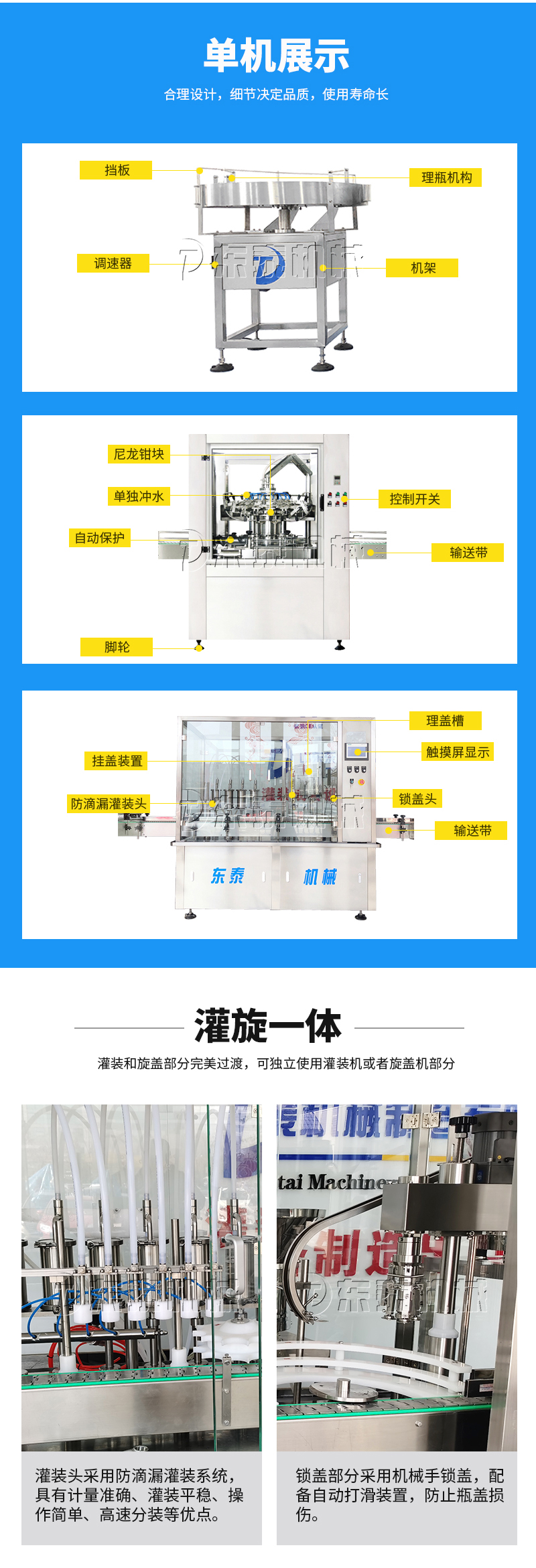 本灌裝流水線設(shè)備具有穩(wěn)定可靠、自動(dòng)化水平高,相比同類產(chǎn)品有著更長(zhǎng)的使用年限,維護(hù)簡(jiǎn)單,整線中各設(shè)備的協(xié)調(diào)性、連貫性強(qiáng),整線設(shè)計(jì)合理等特點(diǎn)。灌裝設(shè)備采用獨(dú)家專利系統(tǒng)結(jié)構(gòu),為當(dāng)今行業(yè)內(nèi)水平,整