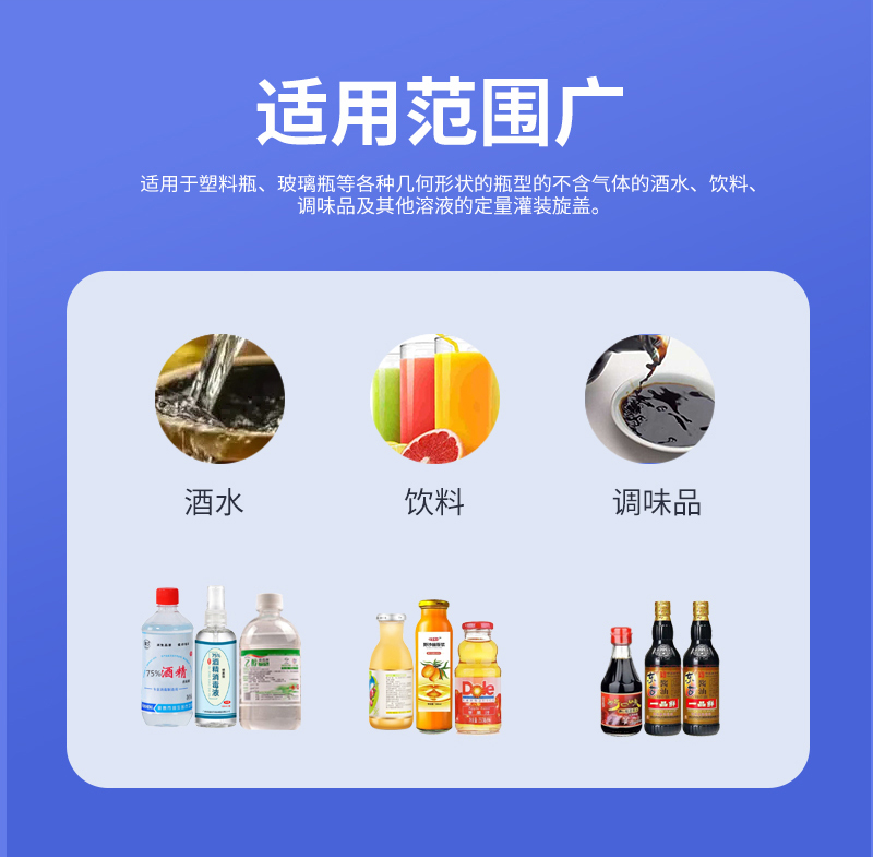 本機(jī)適用于多種材質(zhì),多種幾何形狀的容器,如塑料片、玻璃瓶、金屬瓶等;在需要更換瓶或蓋的時(shí)候,只要調(diào)整部分零件的位置即可,無(wú)需更換任何配件;在旋蓋過(guò)程中可以做到無(wú)瓶不下蓋。理蓋器、輸送機(jī)、旋蓋機(jī)、夾瓶皮帶速度可分別變頻調(diào)速,適應(yīng)在規(guī)定范圍內(nèi)的各類(lèi)規(guī)格的旋蓋。(附:特殊規(guī)格定制即可)