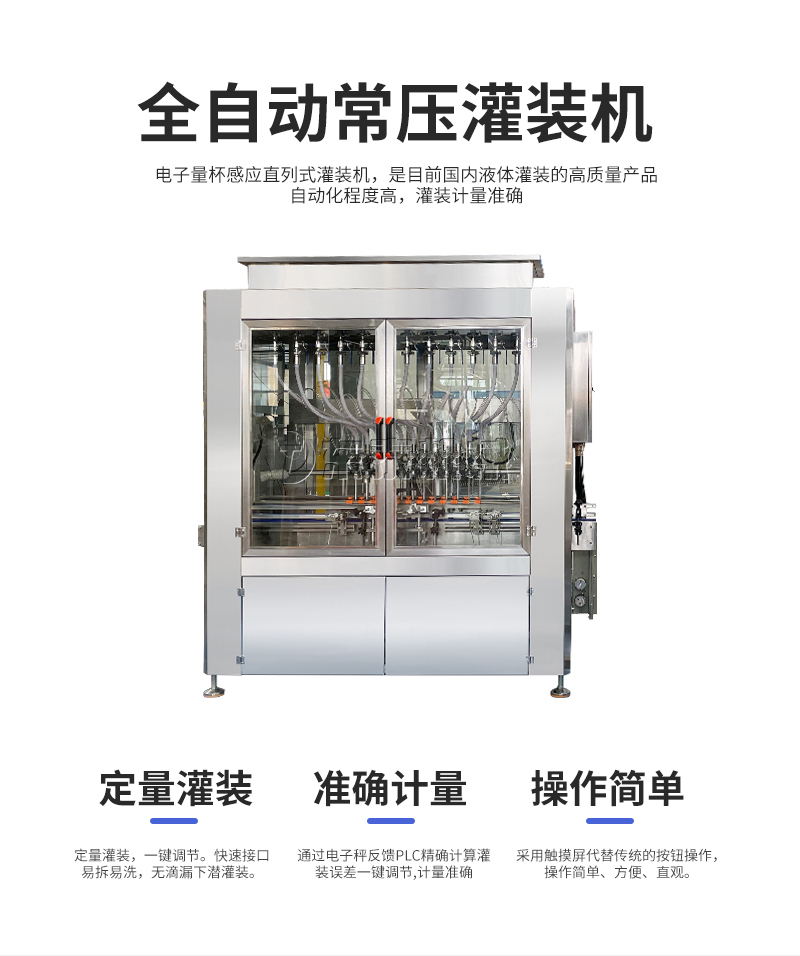 電子量杯感應(yīng)直列式灌裝機(jī),是目前國(guó)內(nèi)液體灌裝的高端產(chǎn)品,自動(dòng)化程度高,灌裝計(jì)量精確,適用于塑料瓶、玻璃瓶等各種幾何形狀的瓶型的不含氣體的酒水、飲料、調(diào)味品及其他溶液的定量灌裝。機(jī)器采用觸摸屏代替?zhèn)鹘y(tǒng)的按鈕操作,操作簡(jiǎn)單、方便、直觀。科技含量高。機(jī)器灌裝計(jì)量可通過(guò)觸摸屏對(duì)灌裝時(shí)間的調(diào)整實(shí)現(xiàn)不同計(jì)量灌裝,方便操作者使用。