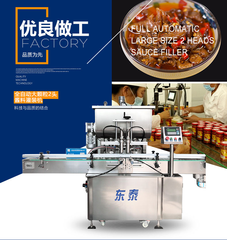 2.灌裝機采用橫推料的方式,大大縮短了下料斗到灌裝頭的距離,提高了灌裝速度,更重要的是解決了含油量大的物料在灌裝過程中出現(xiàn)的有些瓶油多,有些瓶醬多的灌裝難題,大大提高了灌裝精度。