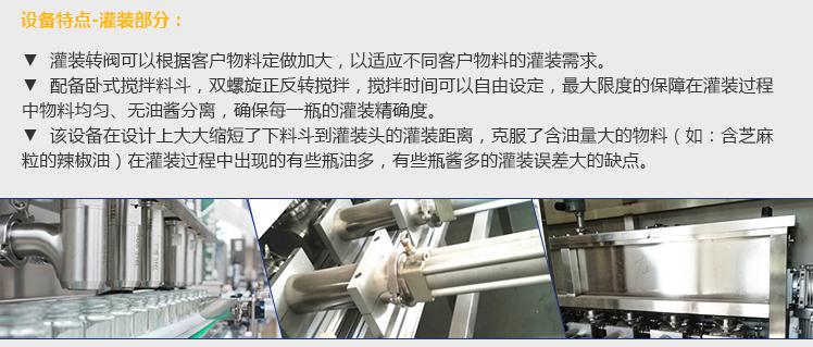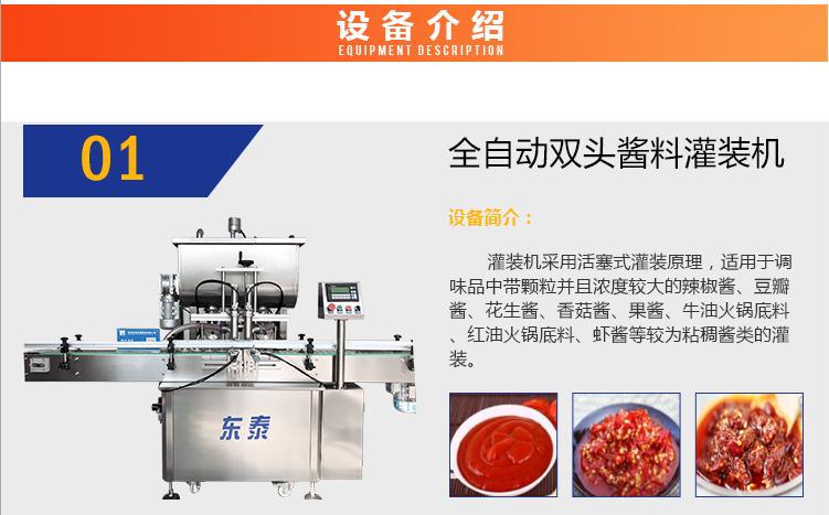 灌裝機采用活塞式灌裝原理,適用于調味品中帶顆粒并且濃度較大的辣椒醬、豆瓣醬、花生醬、香菇醬、果醬、牛油火鍋底料、紅油火鍋底料、蝦醬等較為粘稠醬類的灌裝。