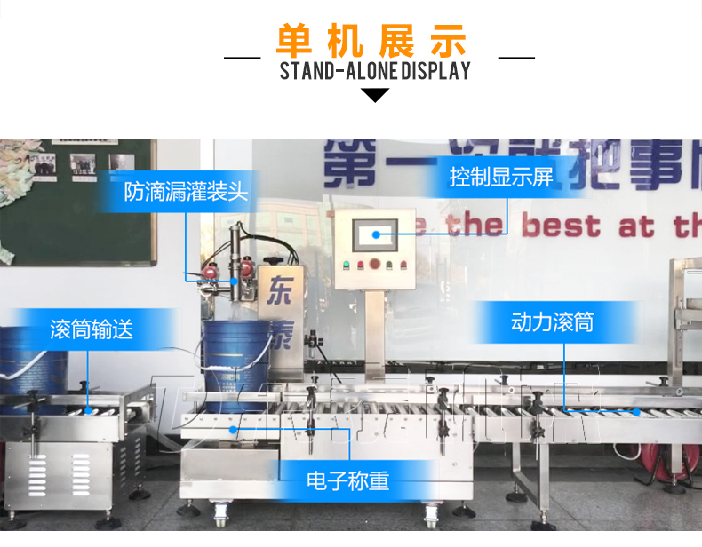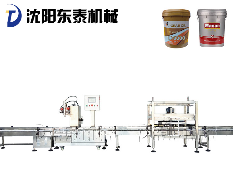 稱重式灌裝封口生產(chǎn)線為半自動(dòng)單頭稱重式灌裝機(jī)搭配在線式壓蓋機(jī),設(shè)備小巧、實(shí)用適合5-30KG敞口桶的灌裝(其它桶型可定制),灌裝時(shí)由人工放置空桶,并啟動(dòng)開始按鈕,待灌裝完畢后放蓋并將桶推岀灌裝位置,動(dòng)力滾筒自動(dòng)傳送至壓蓋杋進(jìn)行壓蓋。壓蓋完畢后可輸送至成品輸送機(jī)上完成整個(gè)操作過程,全程僅需一人即可完成整個(gè)生產(chǎn)過程。此型號(hào)灌裝機(jī)為客戶大大降低了生產(chǎn)勞動(dòng)成本,是大中小型液體灌裝企業(yè)的理想選擇。