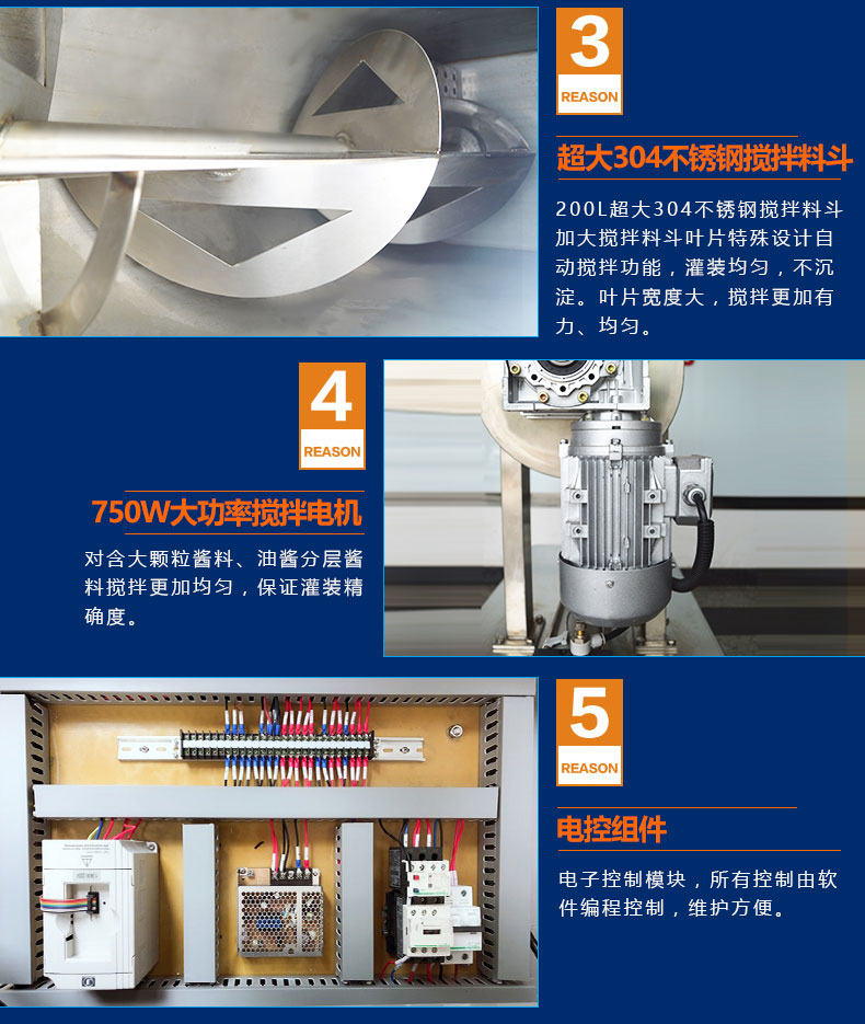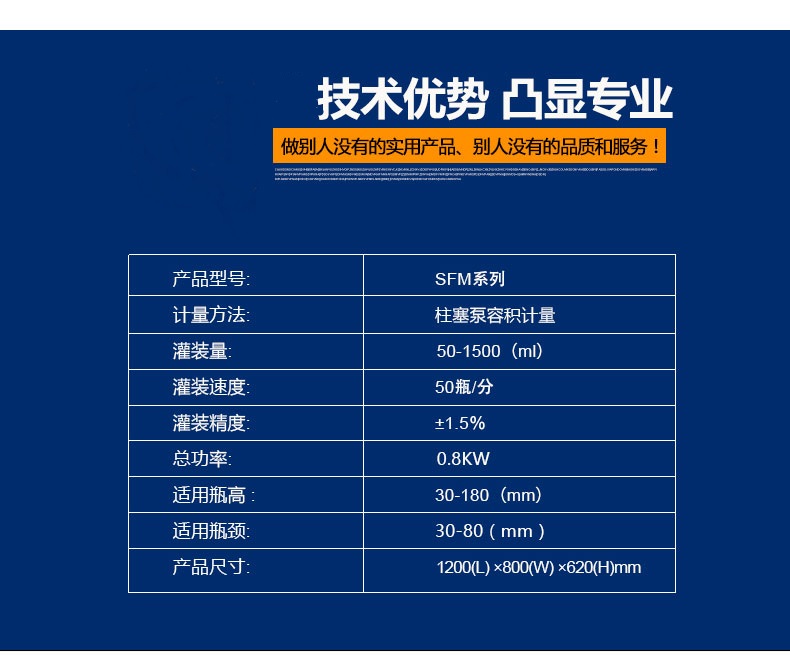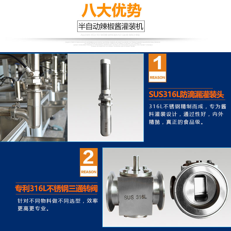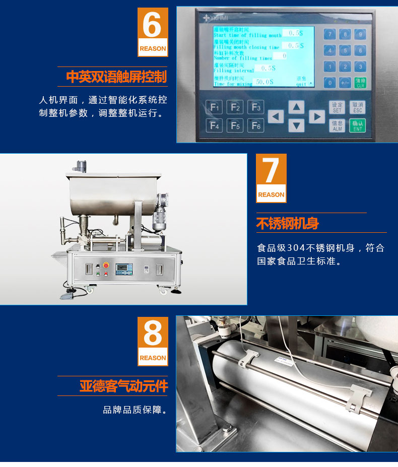 產(chǎn)品簡介:半自動醬類醬料灌裝機SFM系列結構合理、機型小巧、性能可靠、定量準確、操作方便。整機304不銹鋼,灌裝悶頭防漏料防滴油,氣缸驅動結構,加大200L料斗,品牌全鋁殼銅芯大功率攪拌電機,變頻調(diào)速,PLC智能控制,用戶可根據(jù)需要任意調(diào)節(jié)灌裝量及灌裝速度,灌裝精度高。