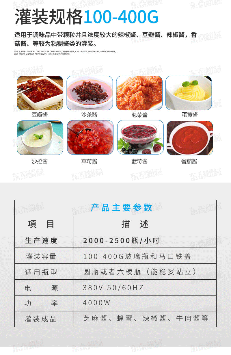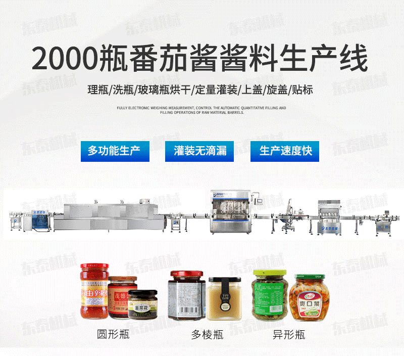 為了能夠更好的服務(wù)社會我們東泰辣椒醬灌裝機踏上了多樣化生產(chǎn)道路,并且現(xiàn)在已經(jīng)有了一定的顯著成績,原來的傳統(tǒng)設(shè)備由于功能有所局限,只能灌裝普通的醬料,而經(jīng)過我們改進后的全自動辣椒醬灌裝機能夠?qū)崿F(xiàn)對市場上絕大多數(shù)的醬料的灌裝,尤其是那些含顆粒的顆粒漿狀流體、半流體、膏體、漿狀類的物料灌裝,如辣椒醬、牛肉醬、牛肉大醬、豆瓣醬、芝麻醬、果醬、火鍋底料的等物料的灌裝,在市場中,辣椒醬灌裝機有眾多的機會來展現(xiàn)出自我的風采,不僅是因為再市場中的廣泛應用,還有這十分出眾的全自動化的一鍵式的完成一系列的工作流程,更能夠凸顯出市場對于它自身的需求。