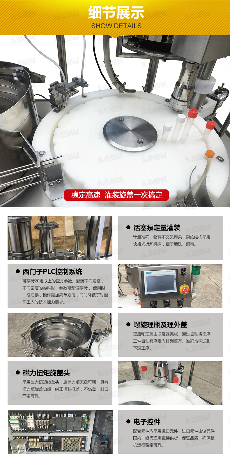診斷試劑灌裝旋蓋一體機是在引進和吸收國外技術(shù)的基礎(chǔ)上,由我公司自主研發(fā)的一款I(lǐng)VD診斷試劑灌裝旋蓋一體機,能同時完成自動理瓶、自動上瓶、定量灌裝、自動理蓋、上蓋和旋蓋封口等動作。本機采用日本高精度封閉式凸輪分度工位器,精度高,運行可靠,使用壽命長。該分度器結(jié)構(gòu)簡單,長期使用無需維修。該型號設(shè)備主要用于ⅣD體外診斷試劑制藥、生物制藥行業(yè)及科研領(lǐng)域裝。機器設(shè)計緊湊合理、外形簡潔美觀,灌裝量調(diào)節(jié)方便。